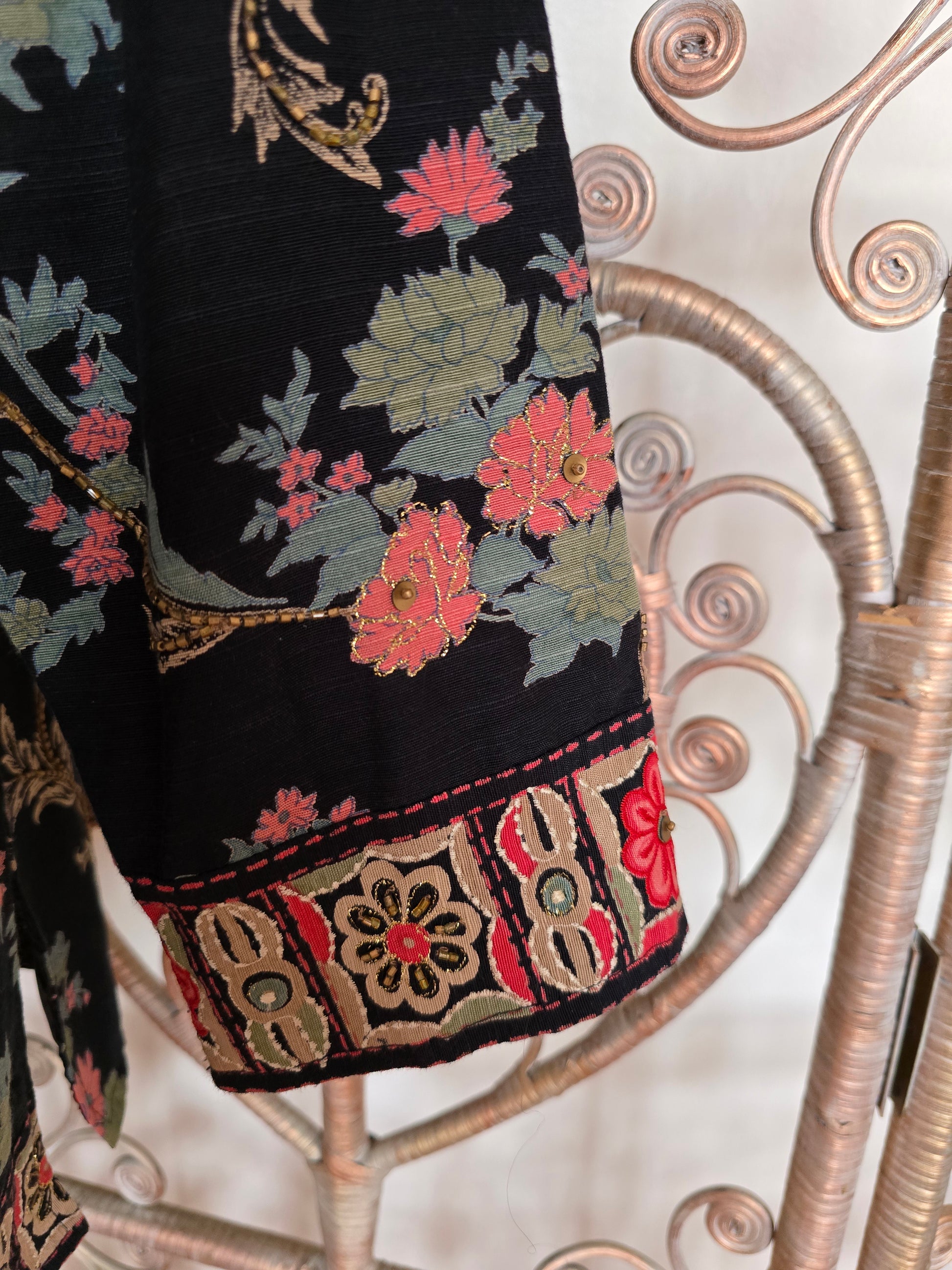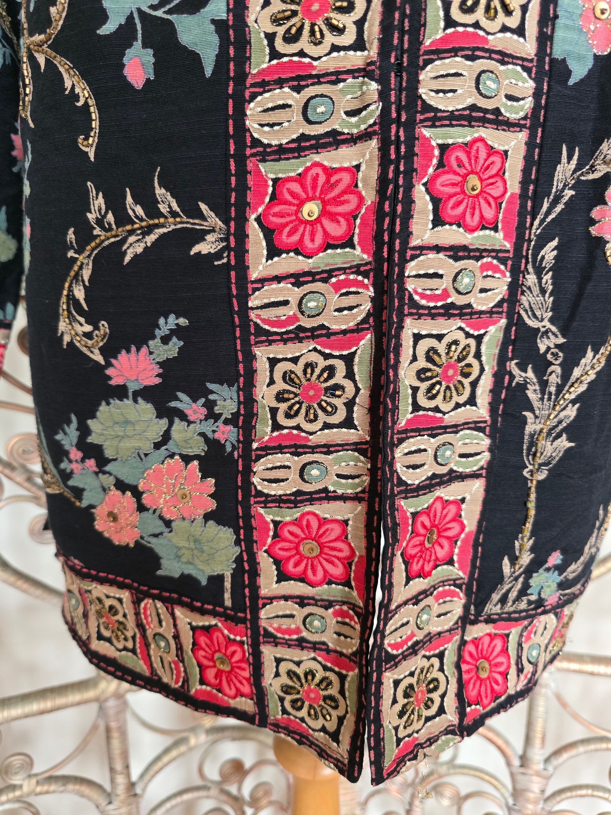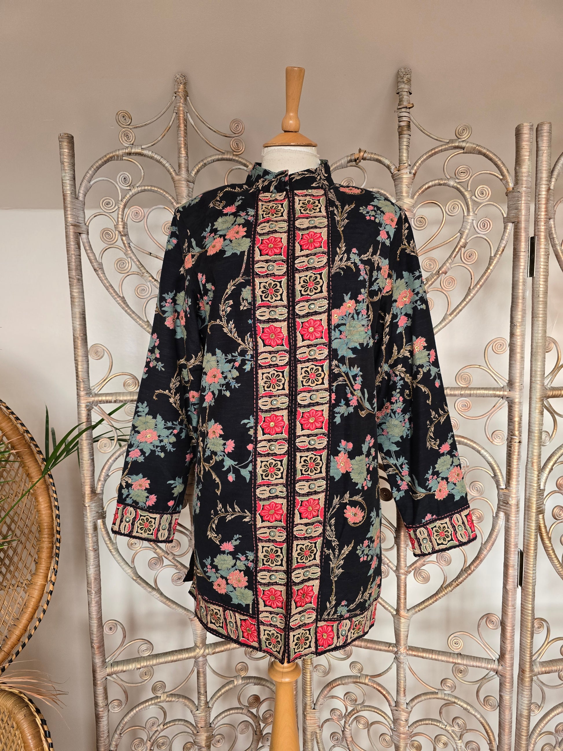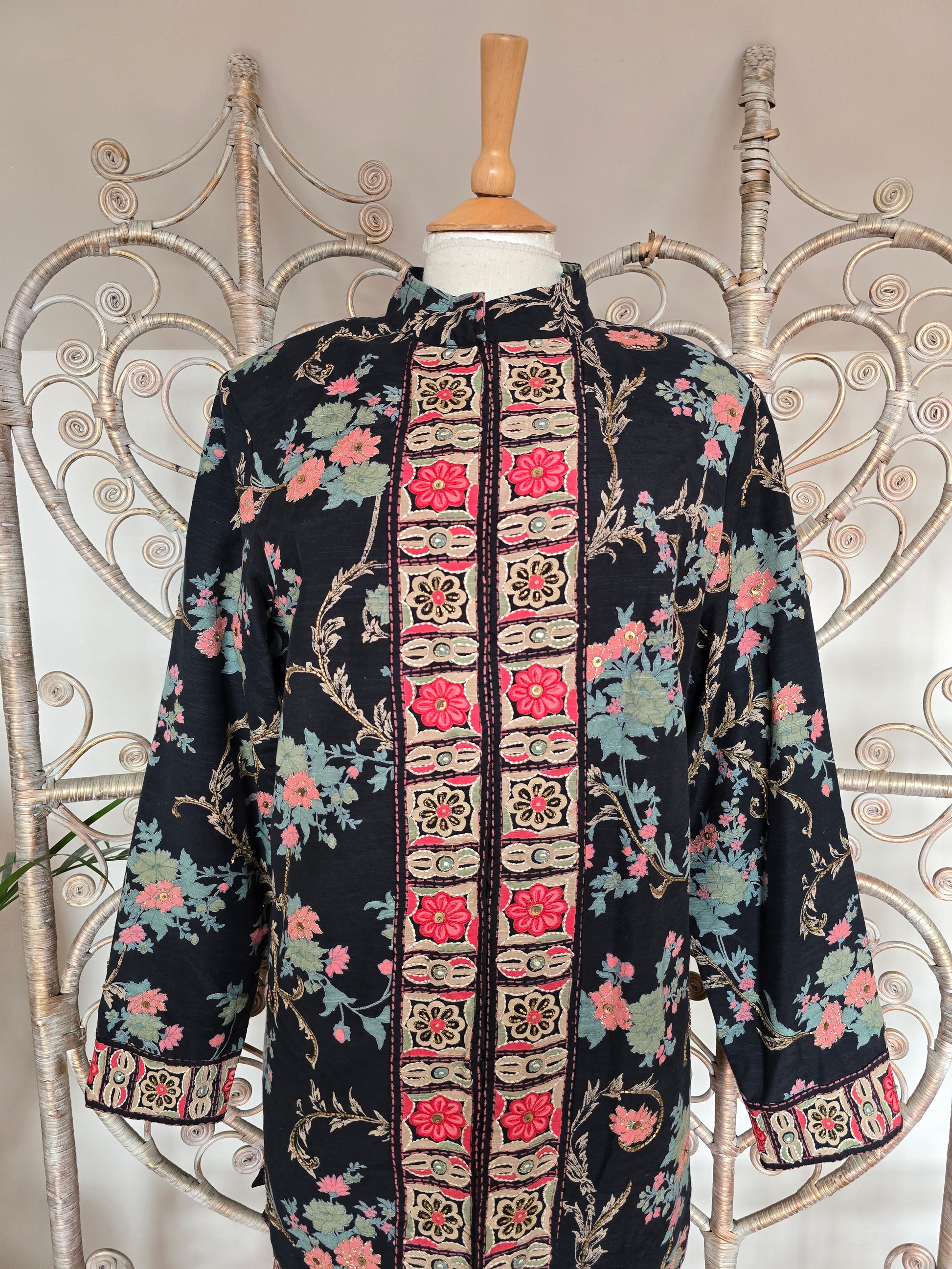 A jacket. Fastens with hooks. I have thid jacket and I wear it as a dress