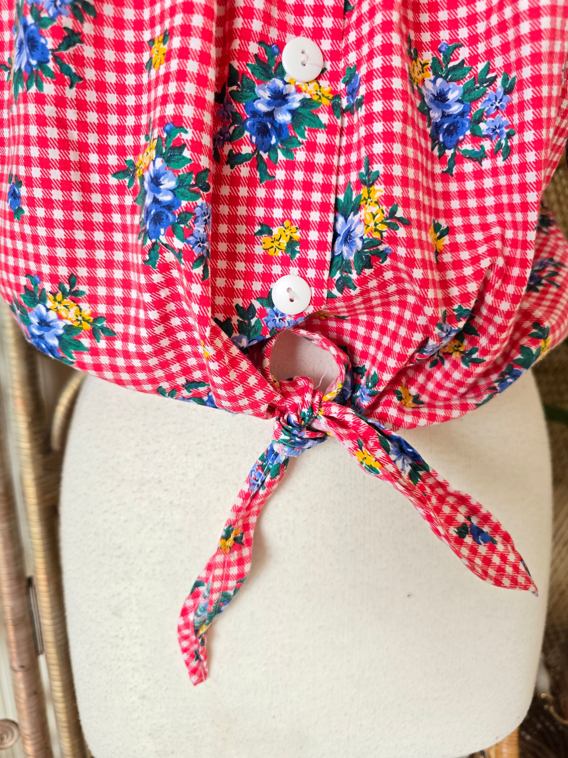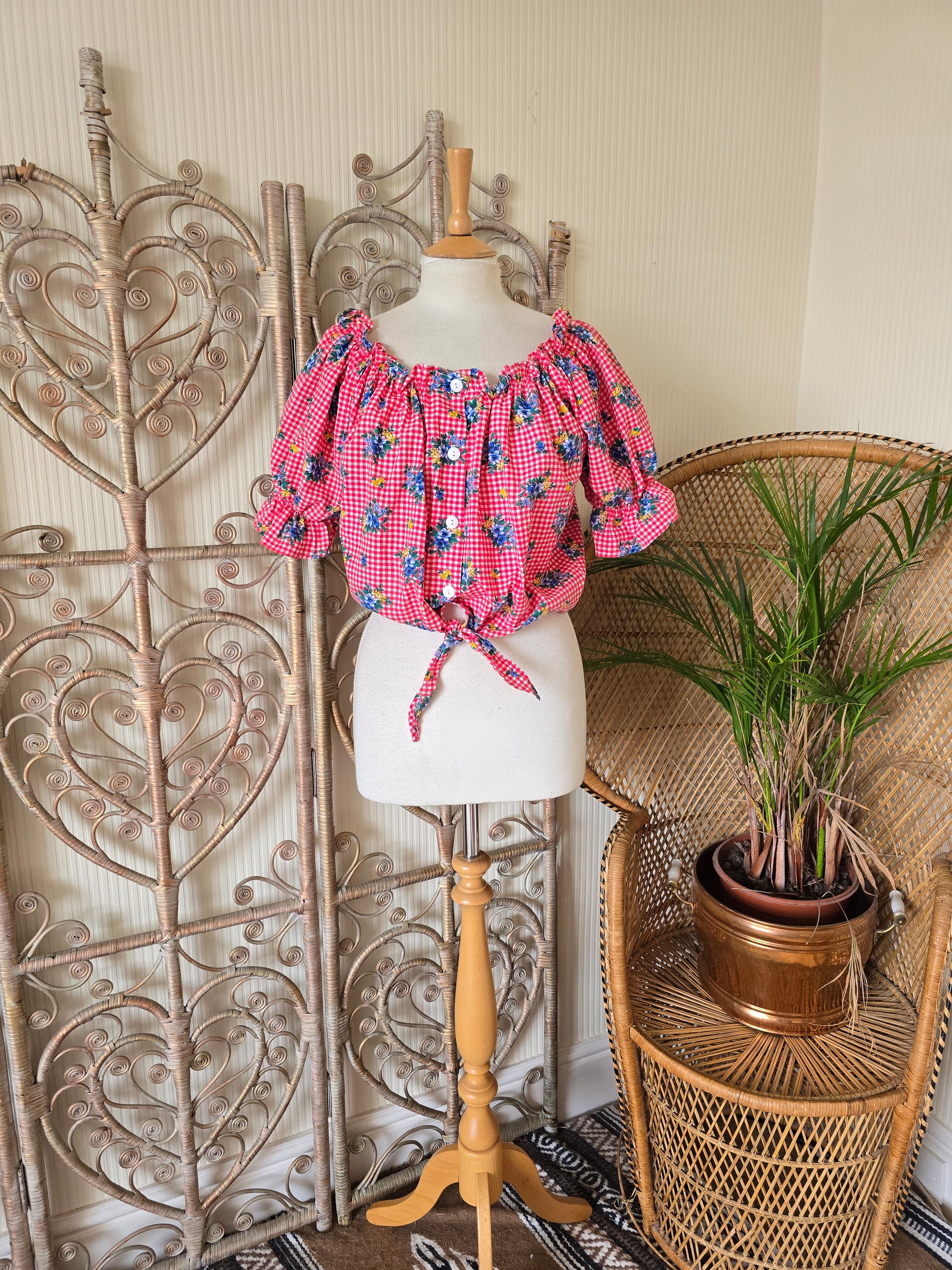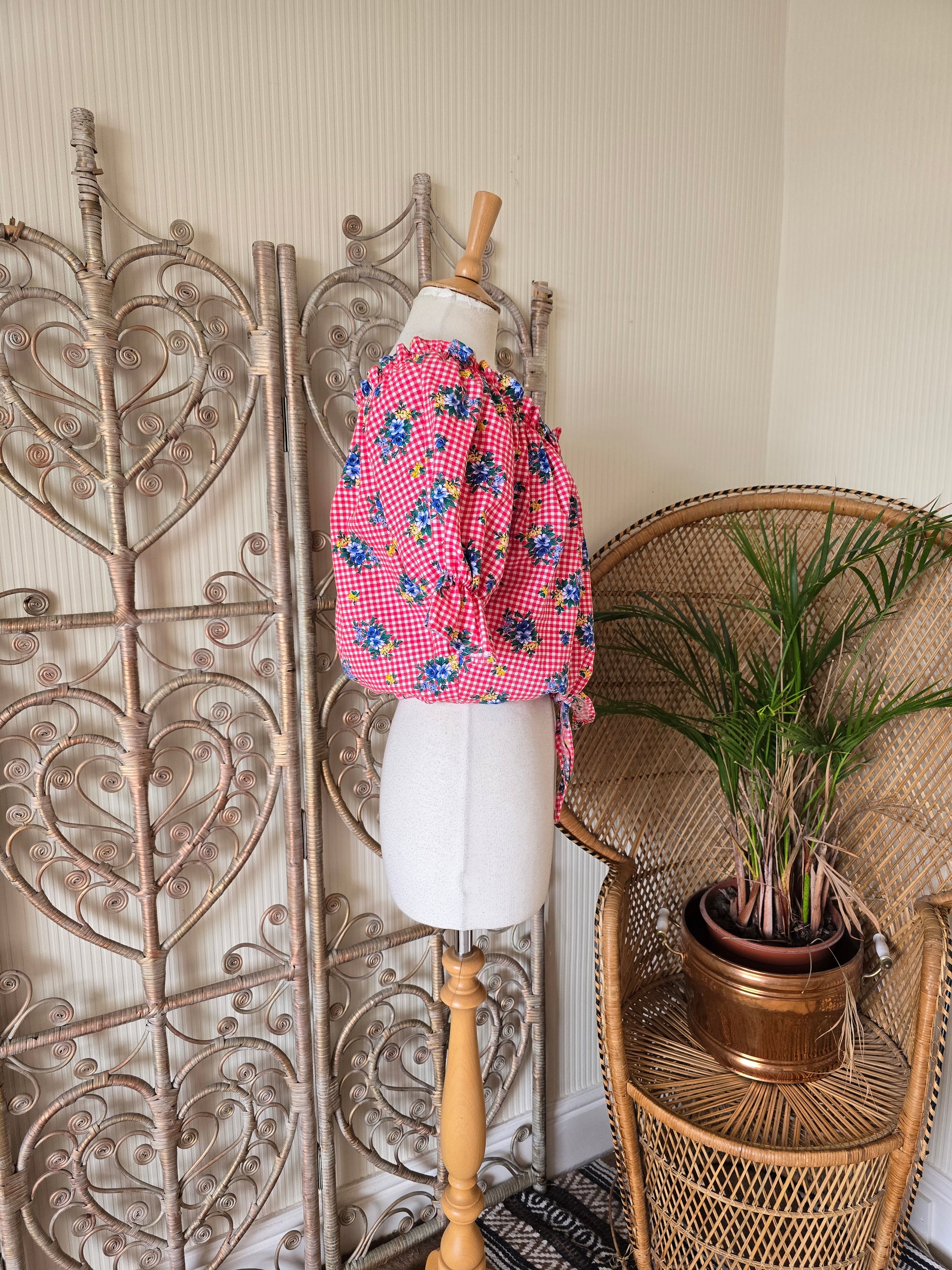 Vintage check tie off shoulders blouse L XL