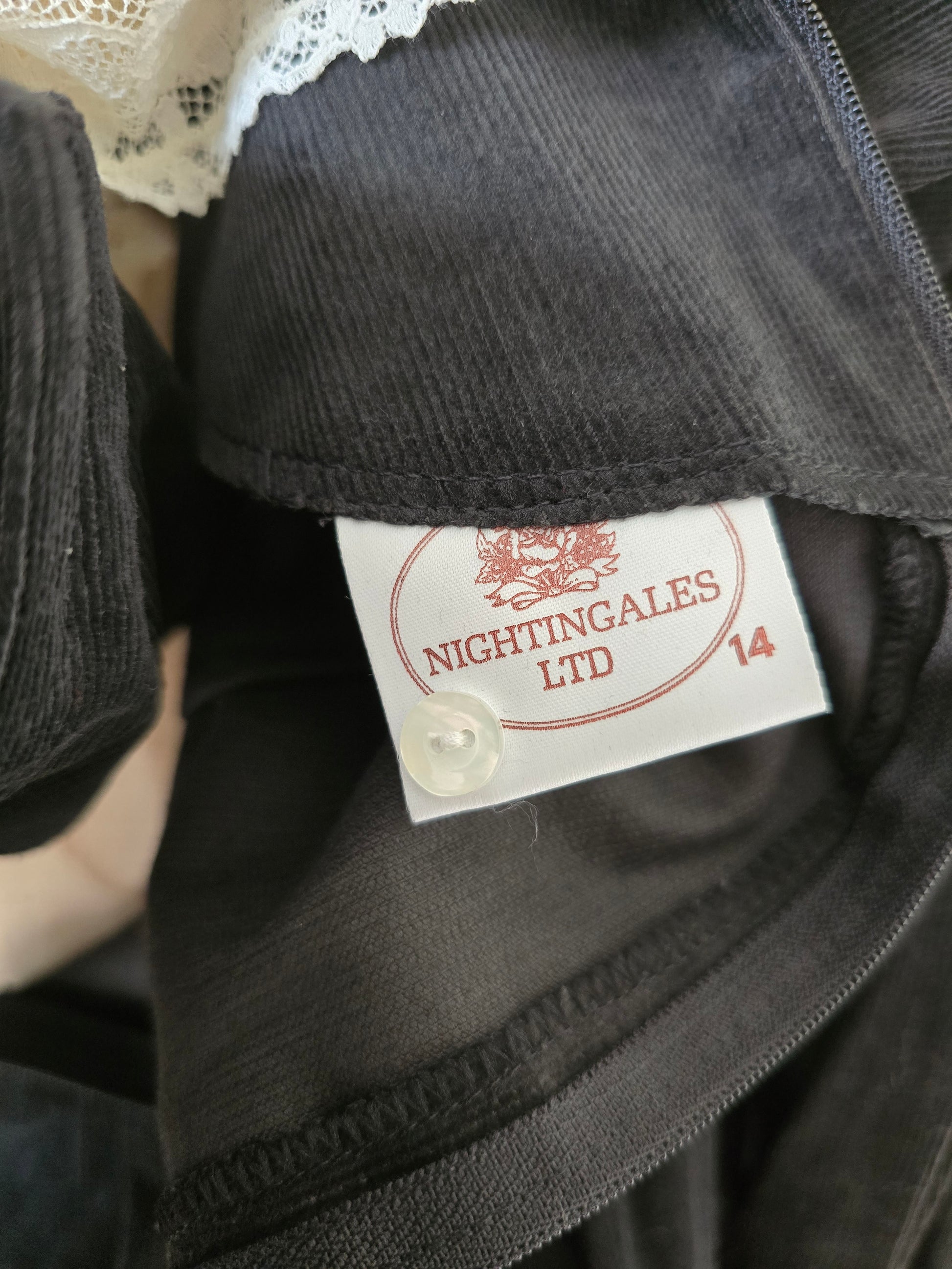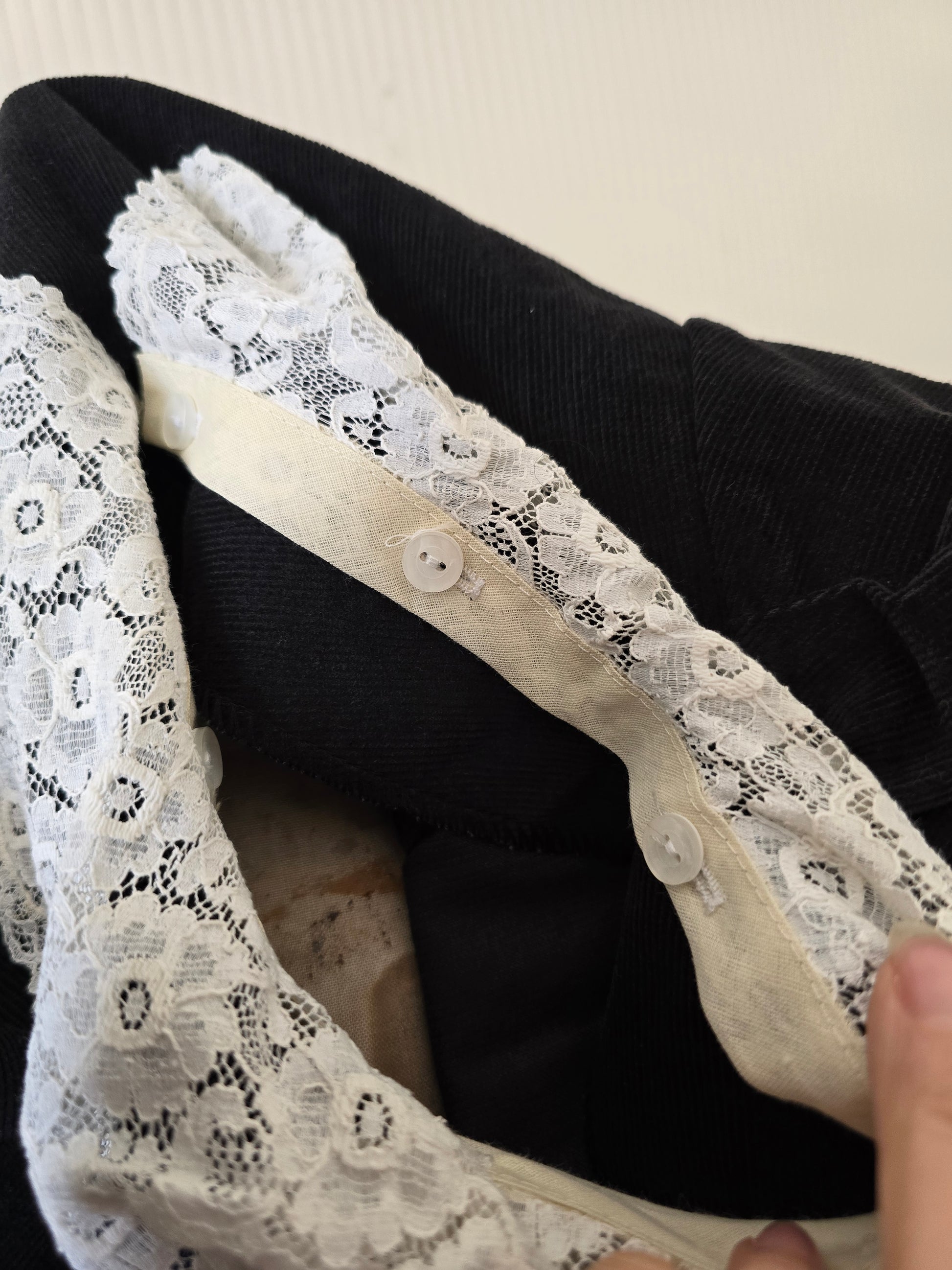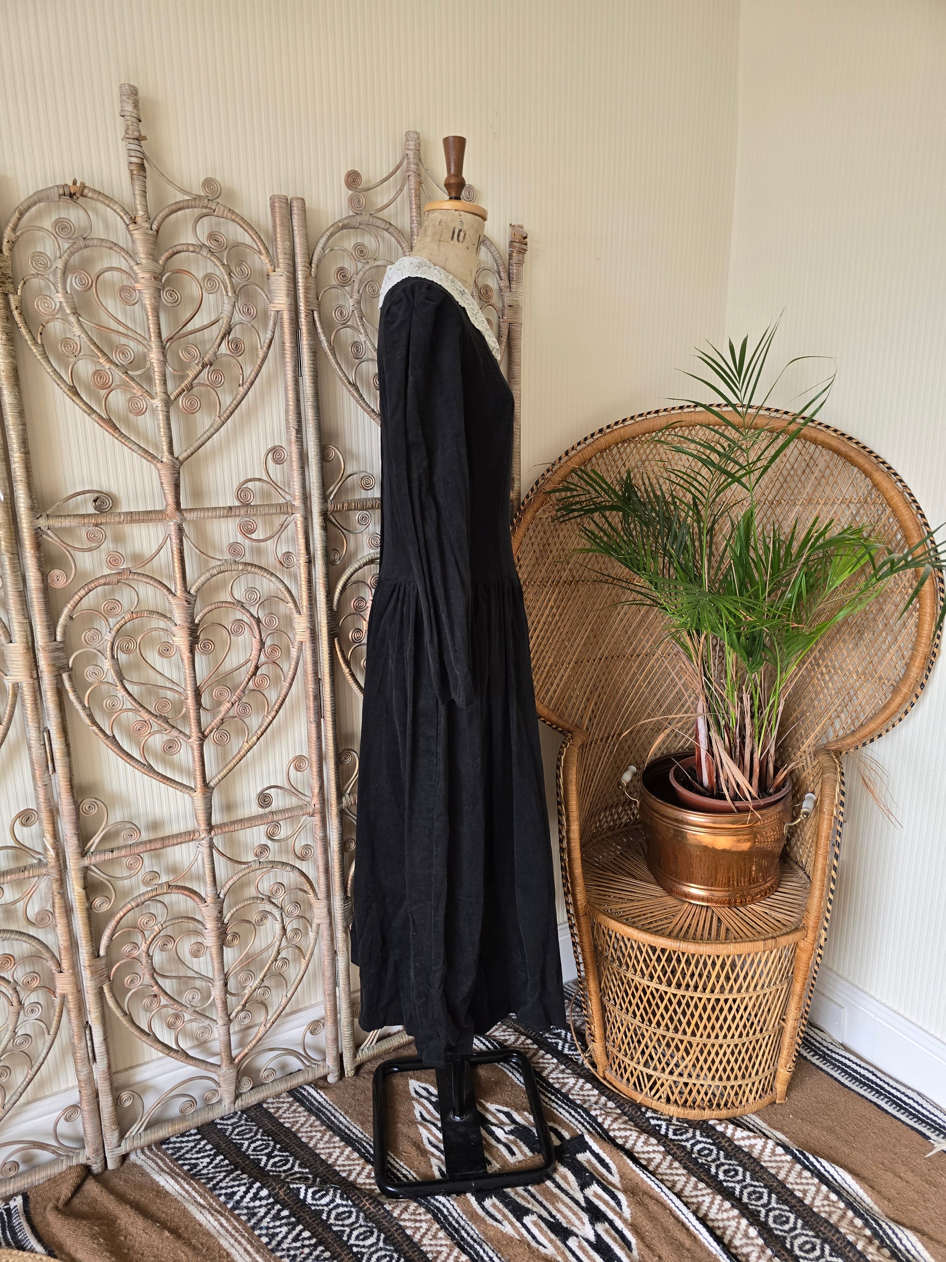 A vintage dress. Fastens at the back with a zip. The lace collar can be taken off with buttons.