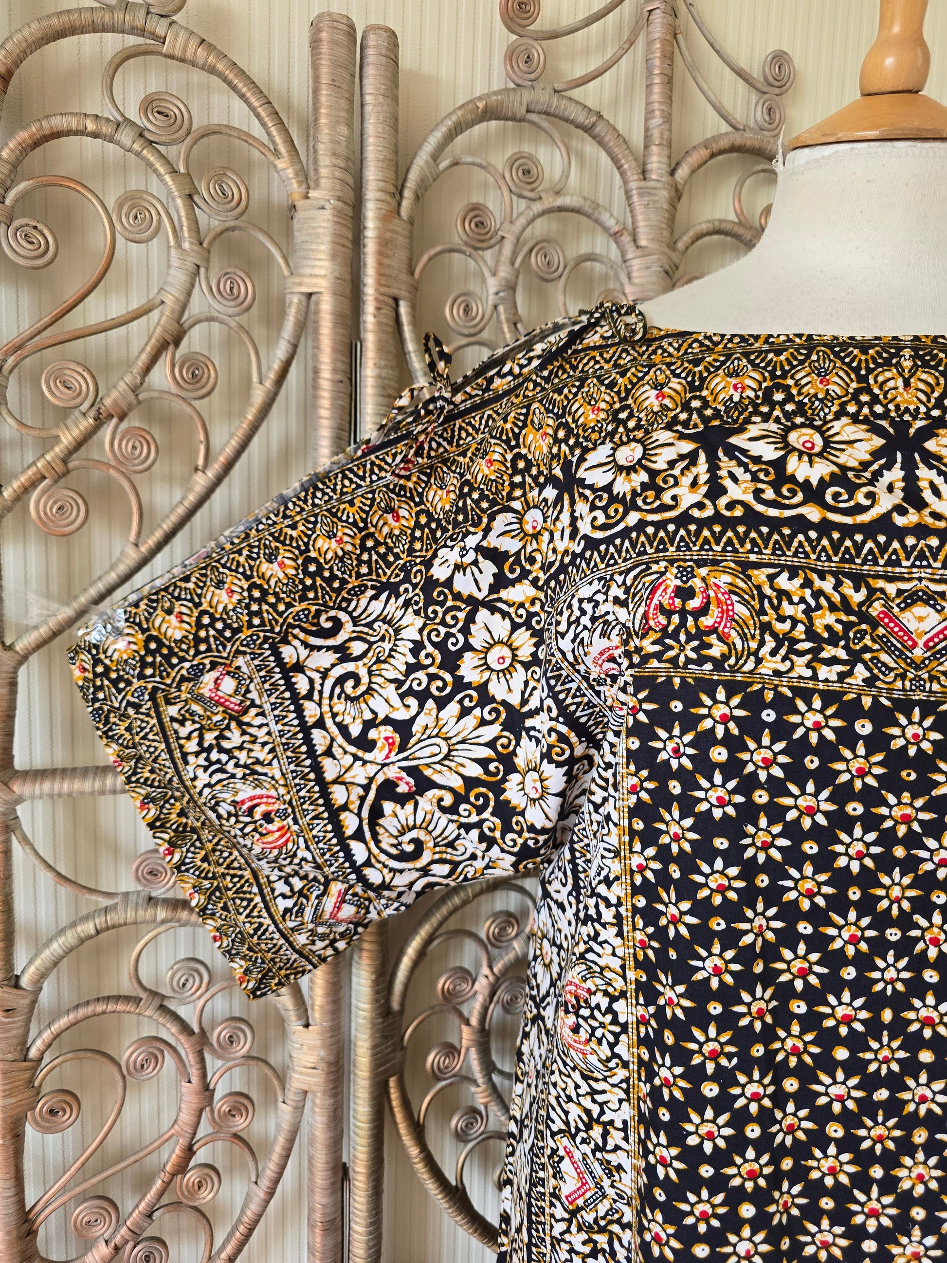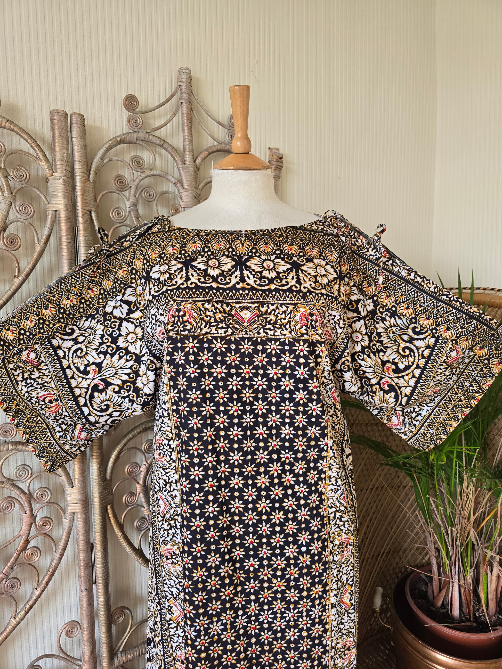 A kaftan dress. Fastens at the back with a zip and ties at the arms