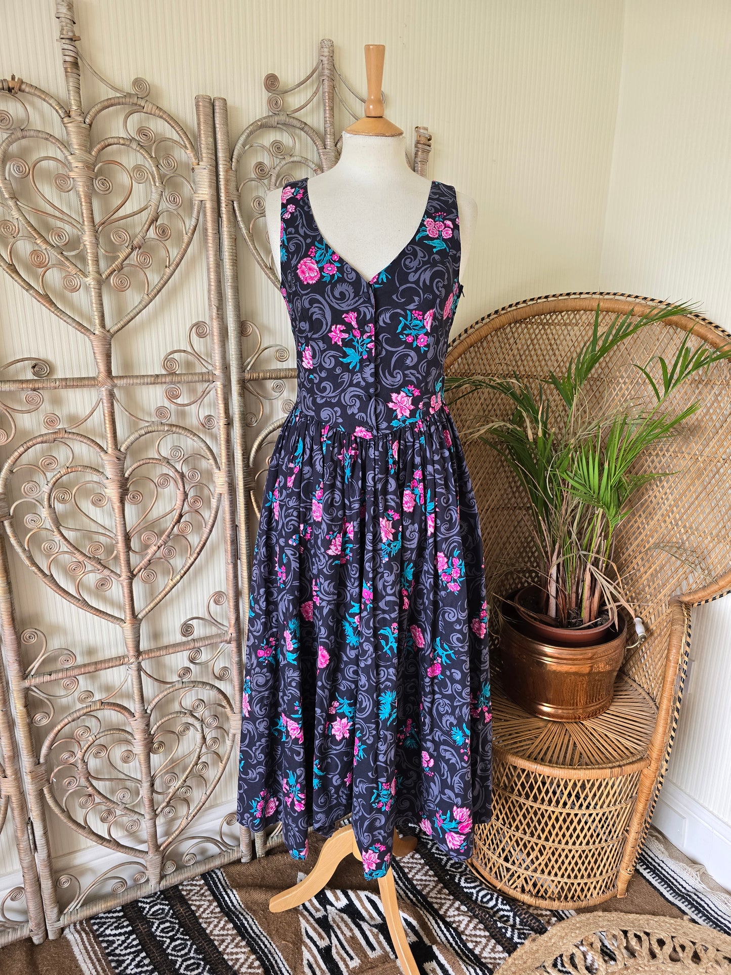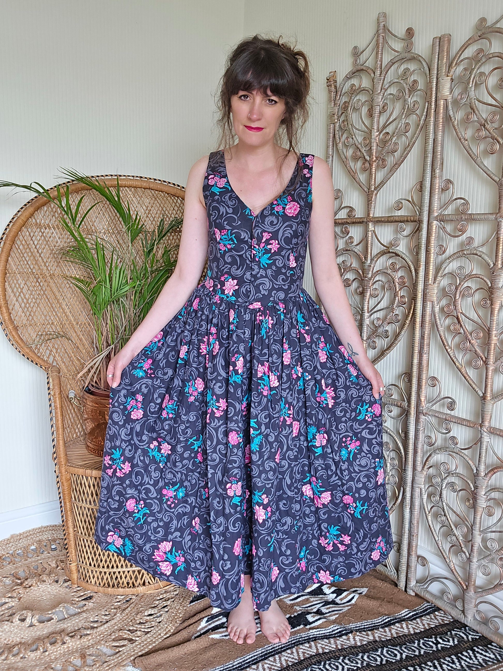 A vintage dress. Fastens at the side with a zip. Buttons as well at the front
